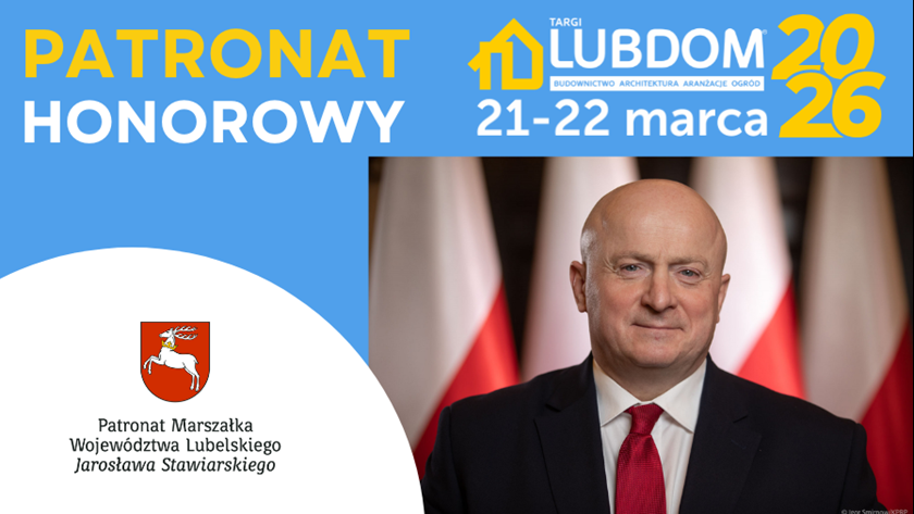 Z przyjemnością informujemy, że Marszałek Lubelski, Pan Jarosław Stawiarski, objął Honorowym Patronatem 45. edycję Targów Budowlanych LUBDOM, które odbędą się w dniach 21–22 marca 2026 roku.